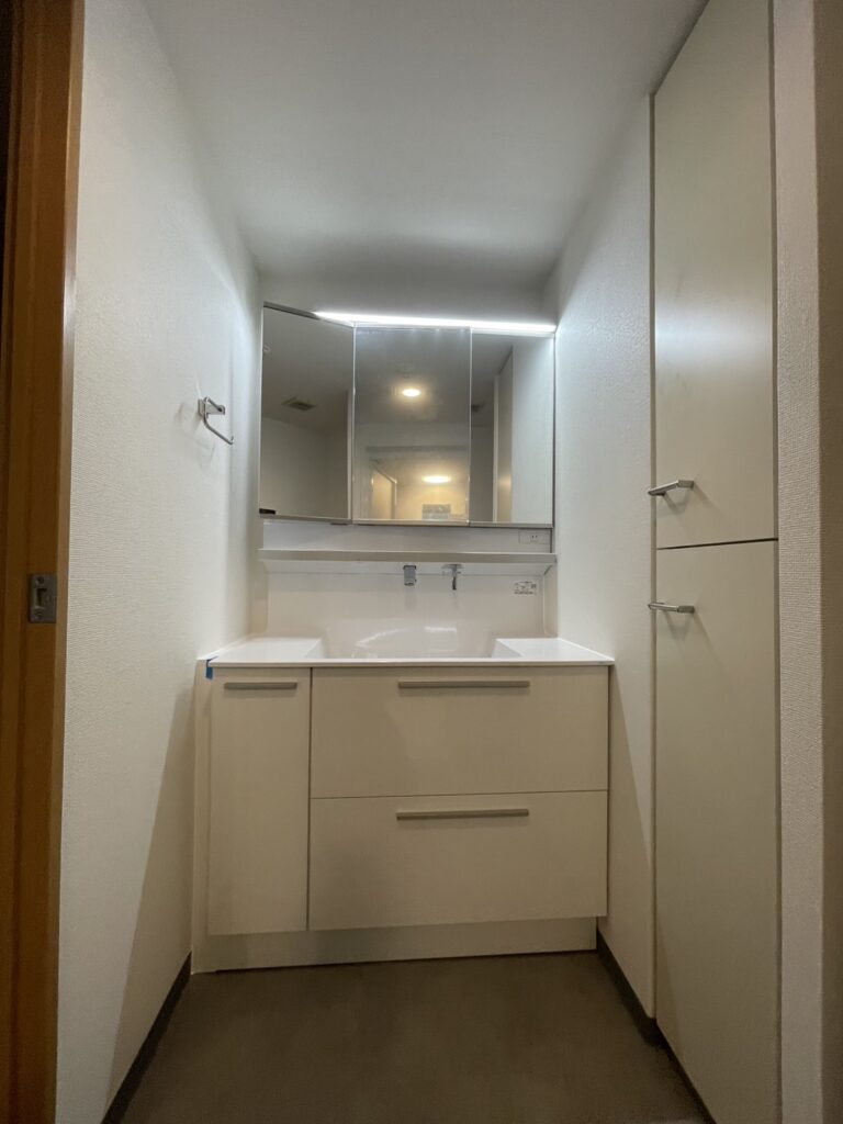 浴室・洗面台ともにTOTOで統一し上質で統一感のある空間に。WYシリーズはやわらかな照明と明るい壁面で広がりを感じさせ、温もりあるリラックス空間を演出します。洗面台のオクターブは、すっきりとしたフォルムに高機能を備え洗練された印象になりました。