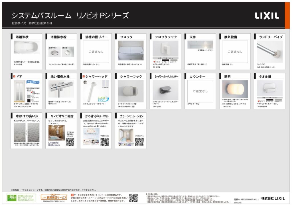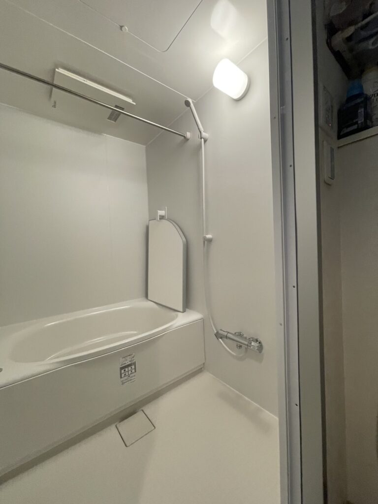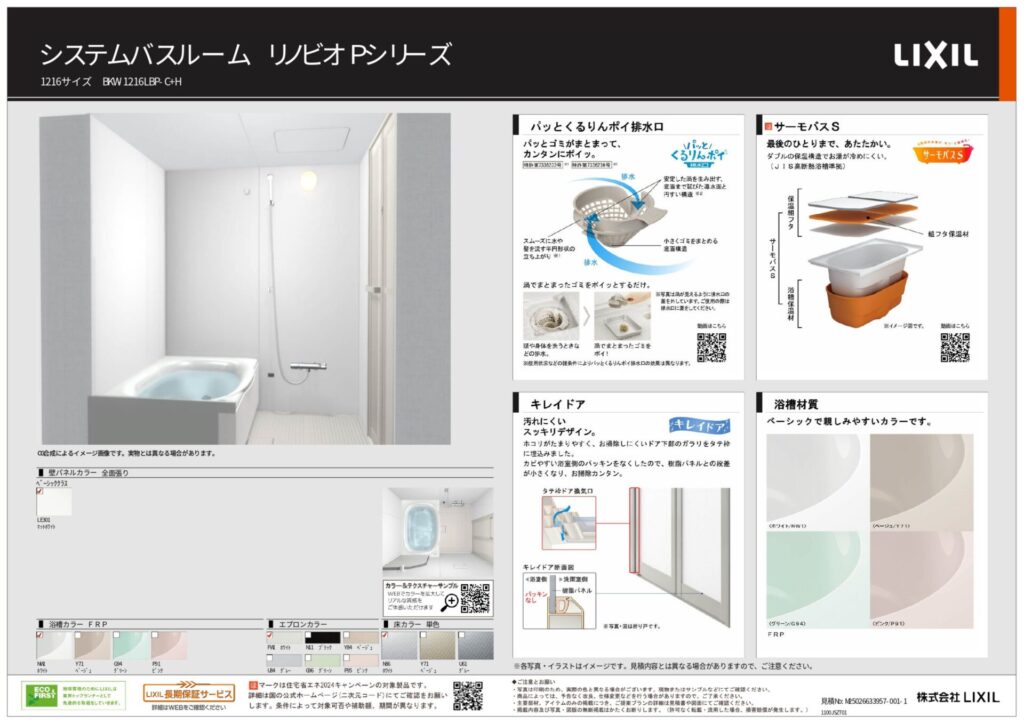 白で統一した清潔感あふれるLIXILリノビオPシリーズの浴室。。断熱性能に優れたサーモバスSはお湯が冷めにくく、家族全員が快適に入浴できます。