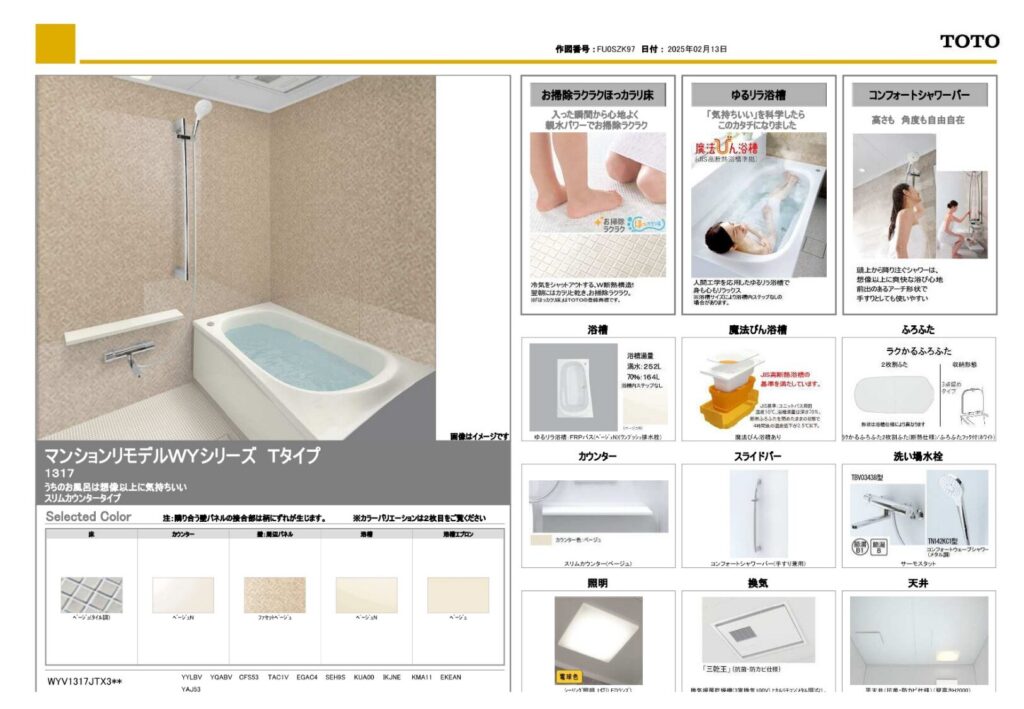 ファセットベージュのパネルとベージュの浴槽が生み出す穏やかな空間にグレーの床がアクセントとして落ち着きを添えます。洗面化粧台のオクターブは、自動水栓や収納力の高い引き出しが特徴で日常での使用が楽しくなります。