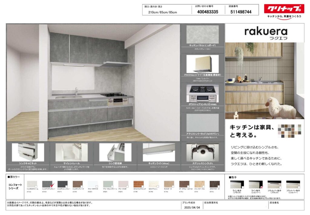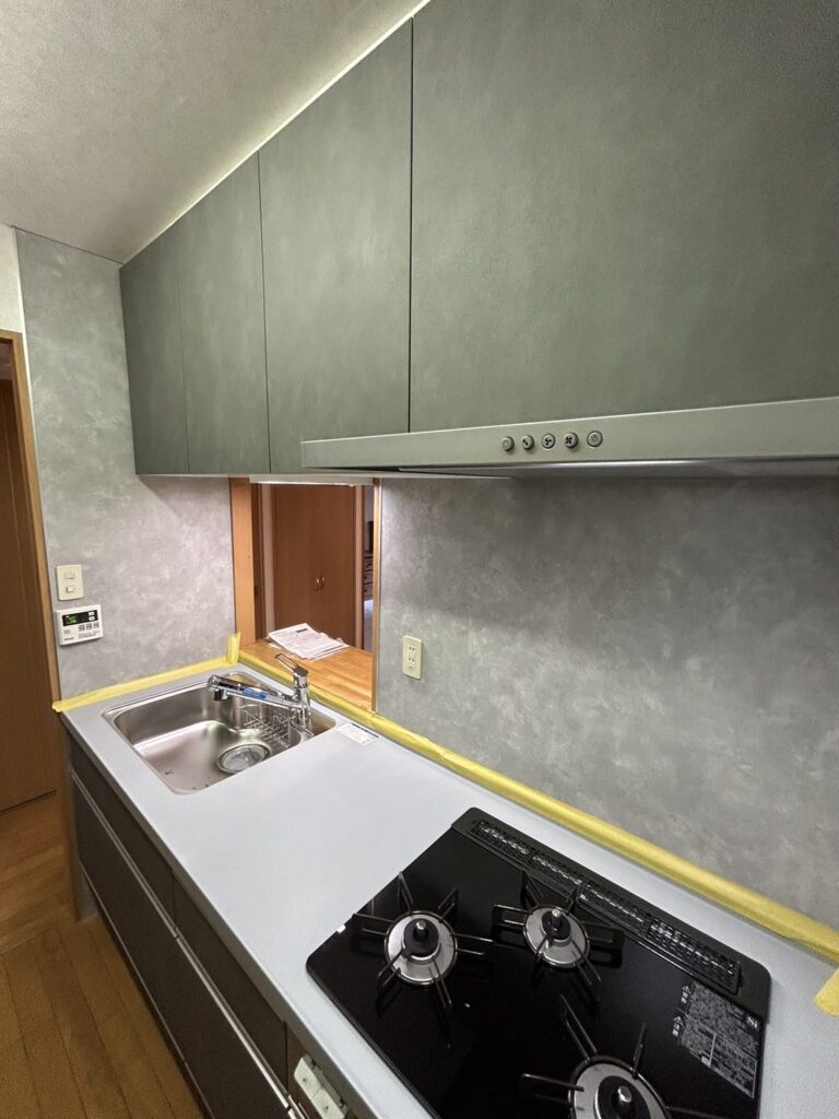 扉カラーのトラッコアイアングレーが空間を穏やかに包み込み落ち着いて過ごせる印象に。スタイリッシュでありながら、心地よさを感じるデザインです。