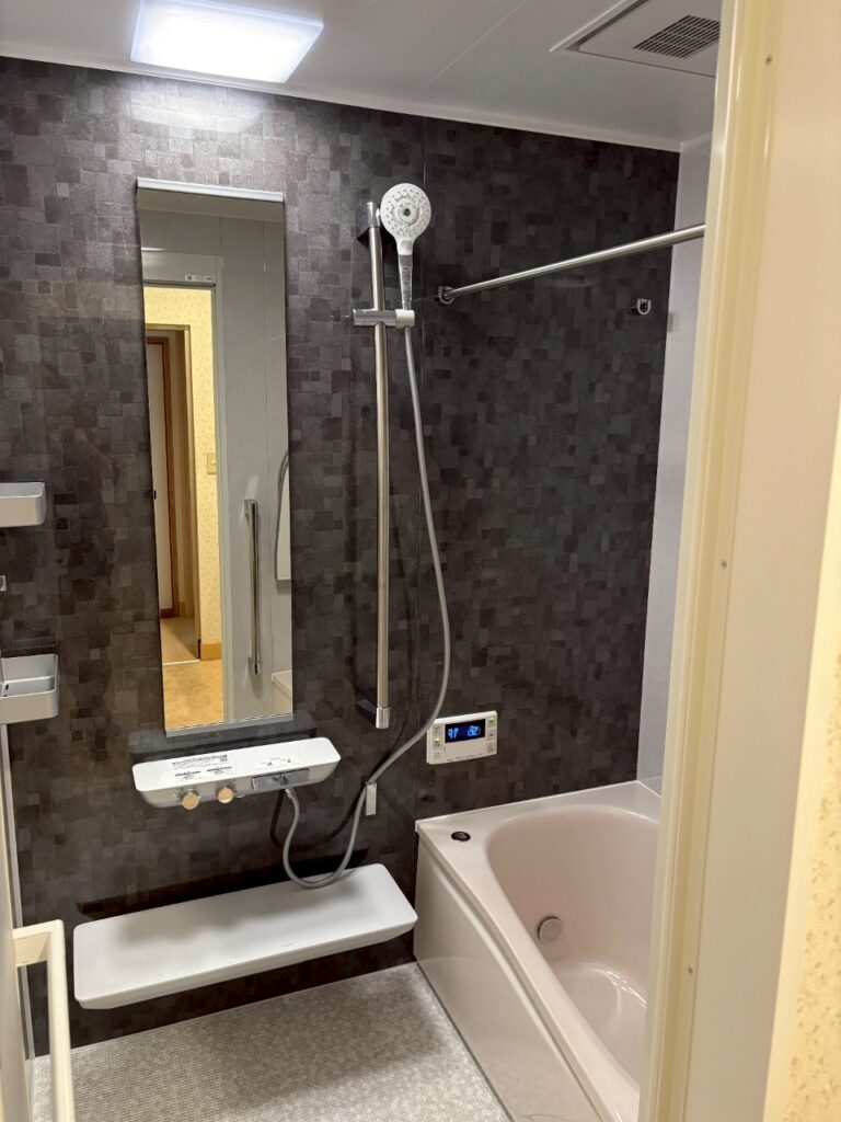 濃色パネル特有の深みがあり、光を受ける角度によって表情が変わるため質感の奥行きがしっかり感じられます。浴槽や床とのコントラストも映え、空間にメリハリが生まれることで落ち着いたホテルライクな雰囲気が楽しめます。