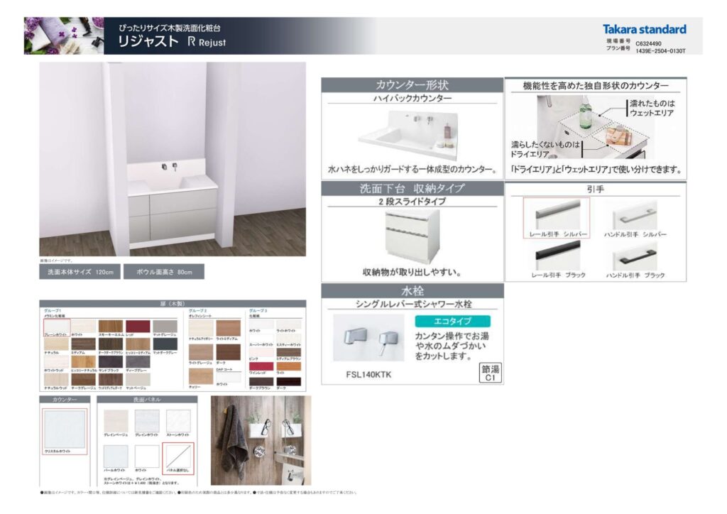 リノビオ Mタイプの壁パネルや床材は、日常の水はねや汚れに強く傷や黄ばみがつきにくい仕様です。タカラスタンダードの洗面化粧台も丈夫で長く使用しても美しさを保てます。