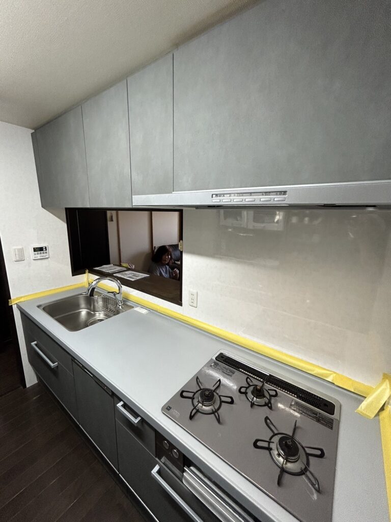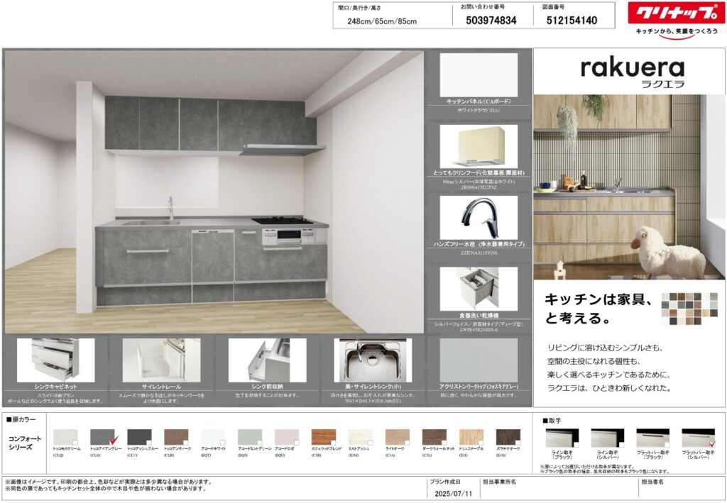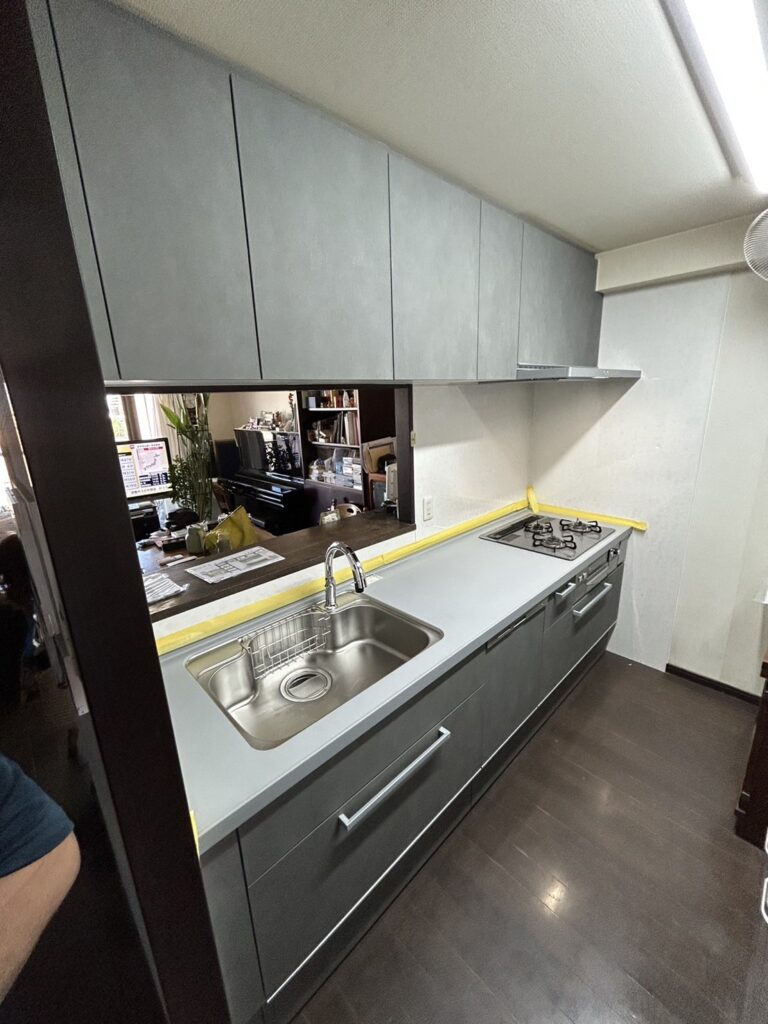 トッコアイアングレーの扉が、キッチン全体に落ち着いた印象を与えています。ワークトップは淡い色味のアクリストンで、扉との間に明暗差がありメリハリを感じられます。