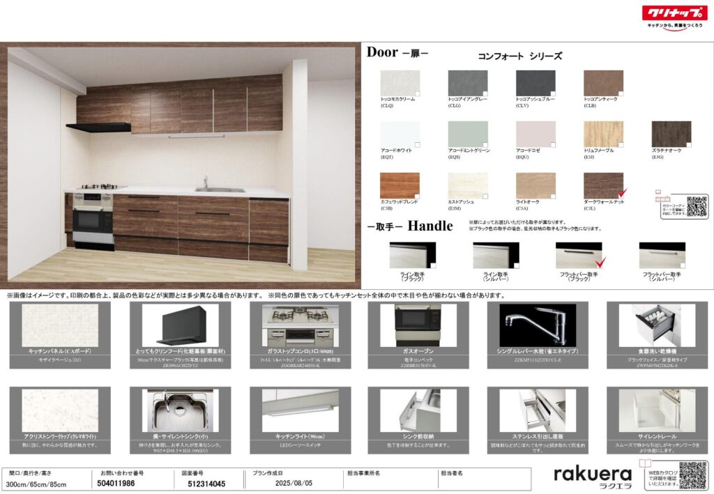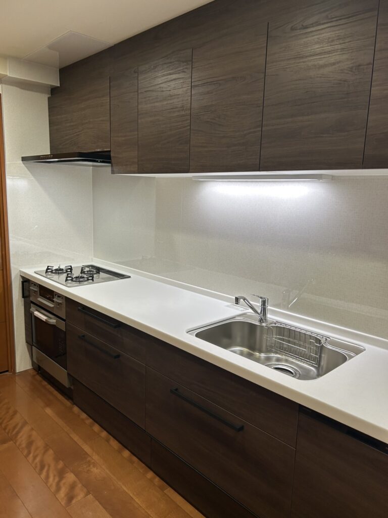 深い木目柄の扉が上下に並び、落ち着いた雰囲気があります。ワークトップは白系で調理台全体が明るく見える仕上がりです。