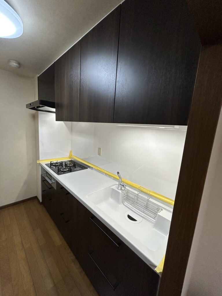 扉はアカシアブラウンの木目柄。濃い色合いで空間が引き締まります。ワークトップは白系の人工大理石で、調理スペースが明るく見える仕様です。