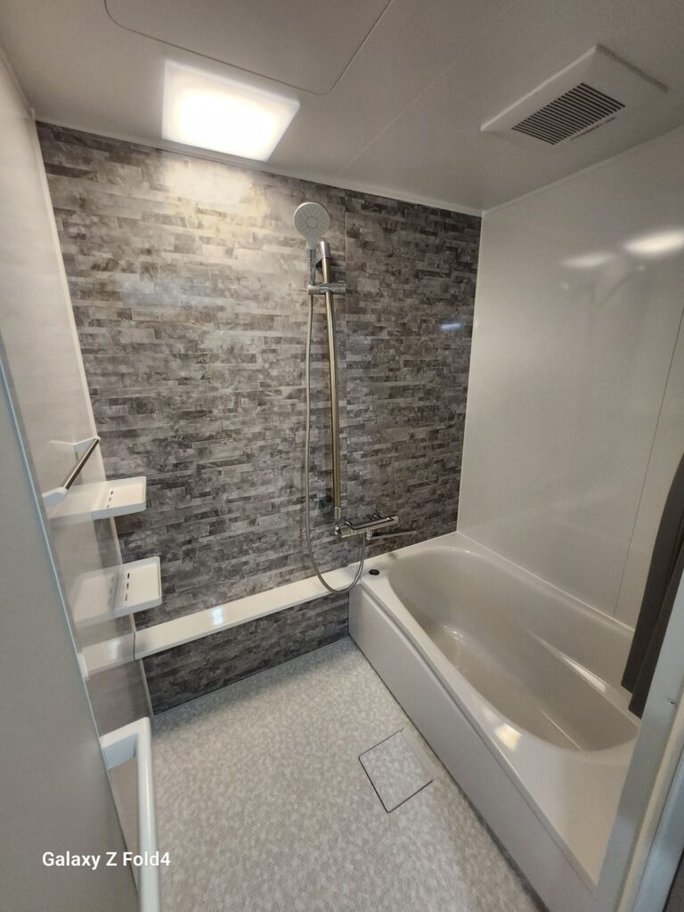 浴槽には人造大理石を採用しています。壁はクレアライトグレーとプリエホワイトのパネル仕様です。床・浴槽・エプロンをホワイトで揃え部位ごとの仕上がりを確認しながら施工しました。