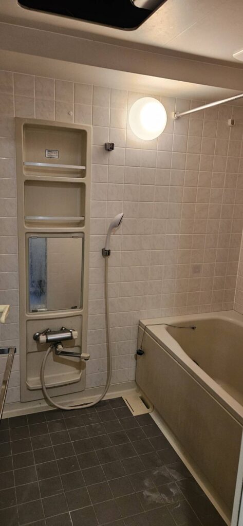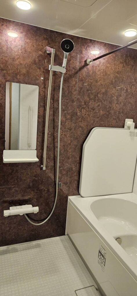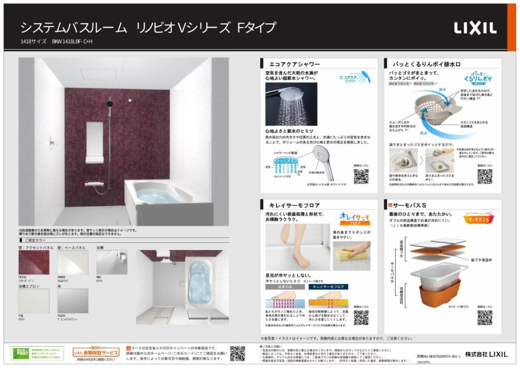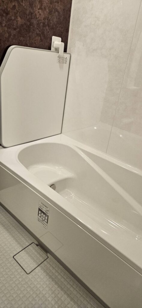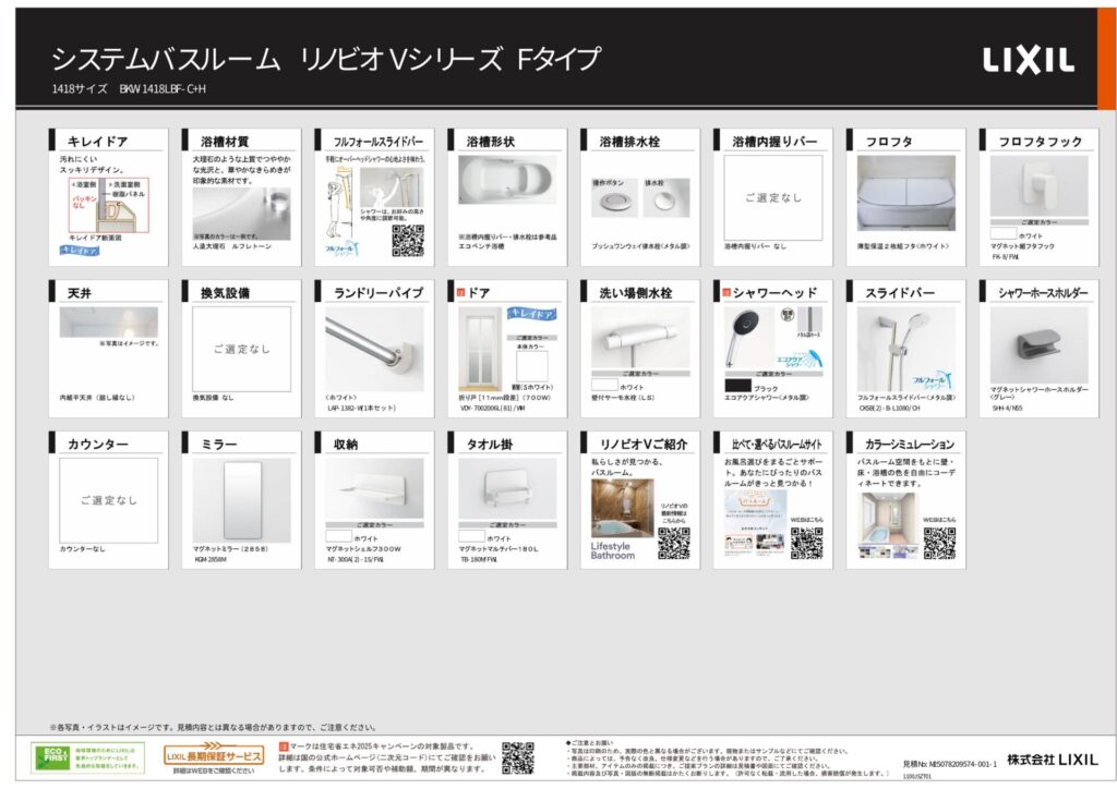 アクセントにフラワーガーデン、ベースにクルムホワイトを選定しています。床はグラニットライトグレー、浴槽はホワイトで、それぞれの色が調和する浴室に仕上がりました。