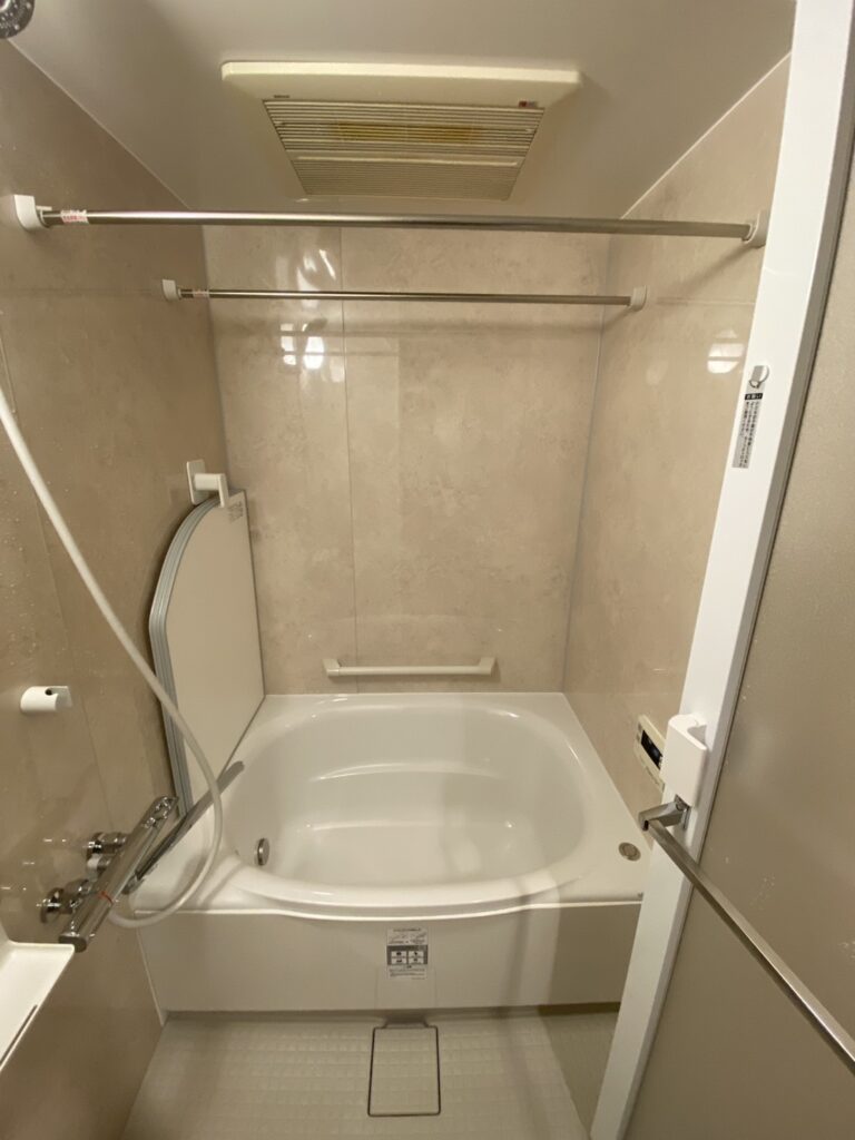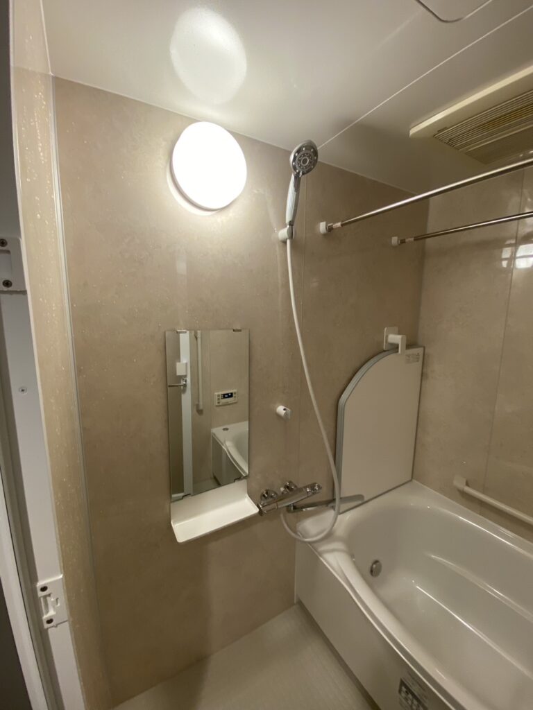 【浴室リフォーム】マーフィルベージュ全面張りでやわらかく整えた LIXILリノビオV Eタイプ