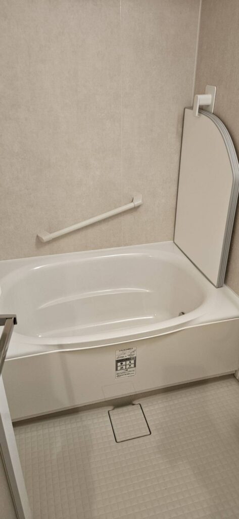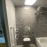 カウンターは設置せず浴槽まわりを広く使える構成です。収納はマグネットシェルフ300Wのみ。置く物を限定できるため散らかりにくい仕様です。