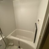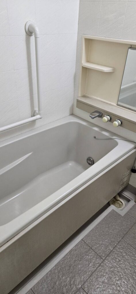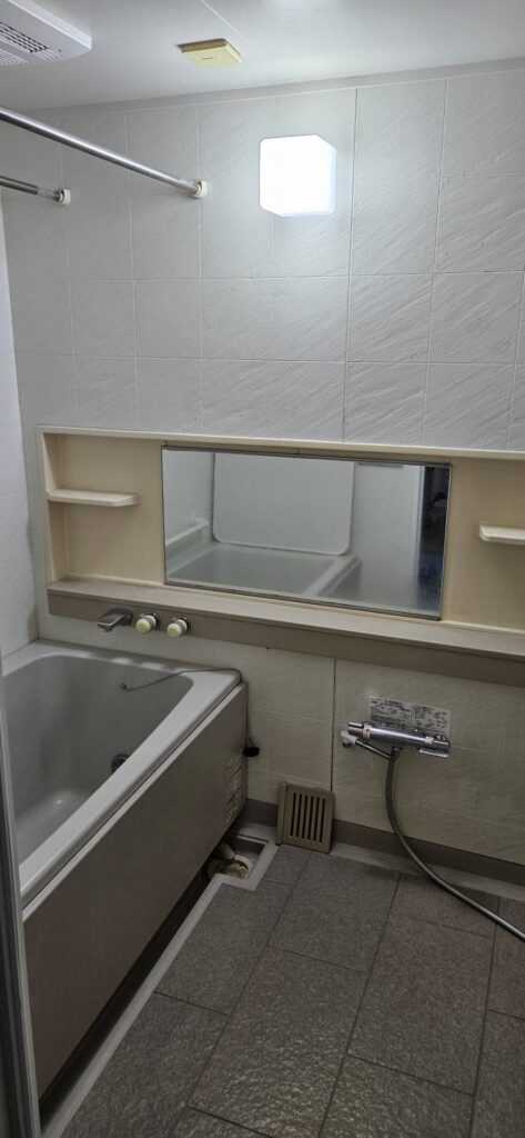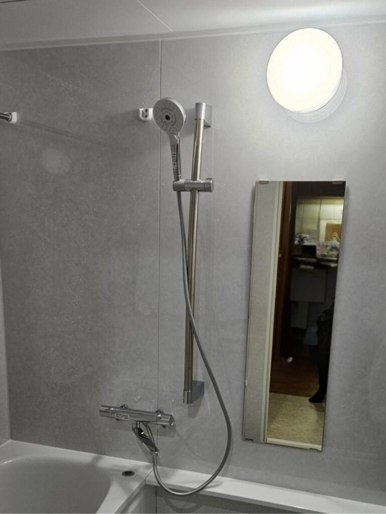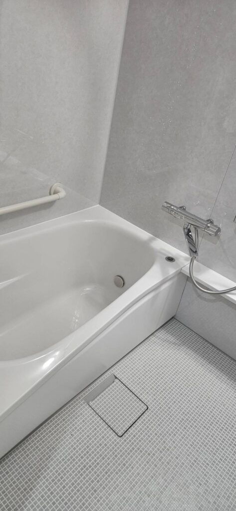 床はライトグレー(タイル調)、壁はコムホワイトグレー。浴槽とエプロンはホワイトで統一しています。浴槽はゆるリラ浴槽と魔法びん浴槽仕様。