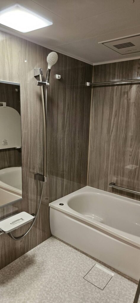 壁にグレイッシュウォルナットを採用し、床と浴槽はホワイトに。水栓は棚W300のスッキリ棚水栓を選び、コンフォートシャワーバーを組み合わせ日々の入浴が快適に。