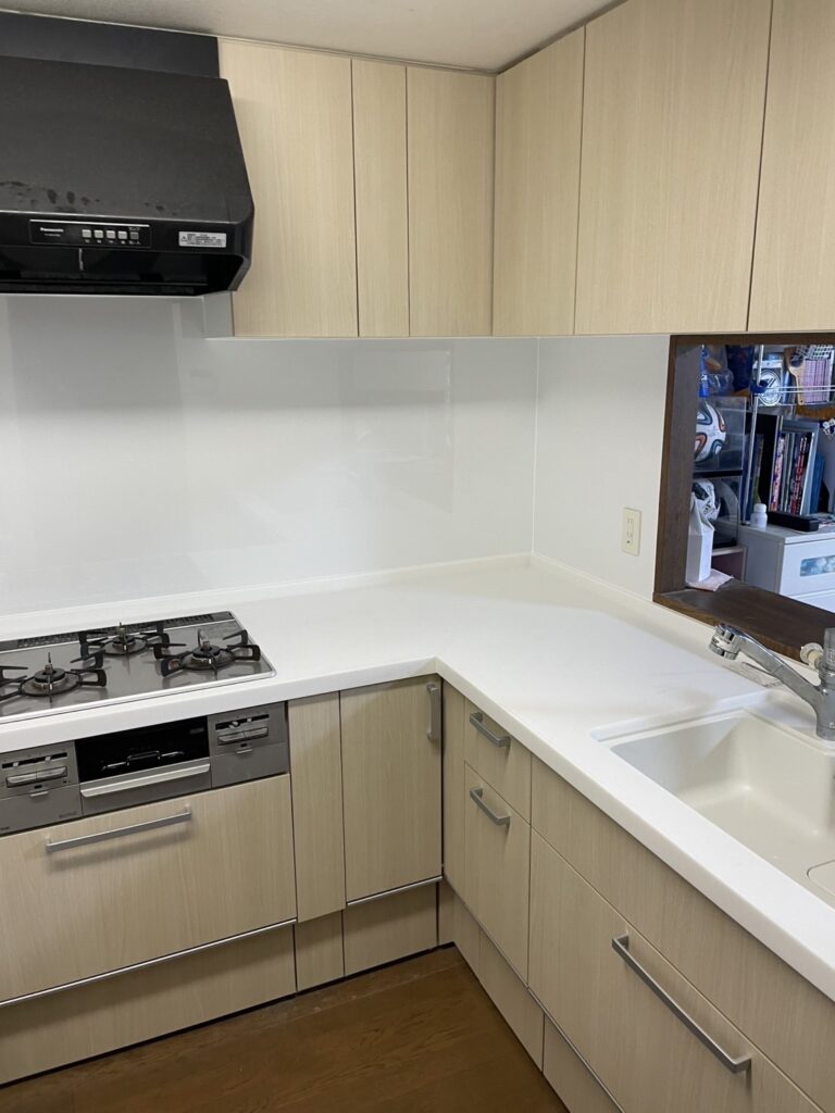 扉カラーにはペールウッドを選定し、やわらかな木目の風合いがキッチン空間に自然な温かみをもたらします。ワークトップにはアクリストンワークトップ(クレマホワイト)を採用し、人工素材ならではの滑らかな表面が汚れをしっかりとはじくため、調理スペースをいつも清潔に保ちやすく毎日のお手入れも手軽な仕様に仕上げています。