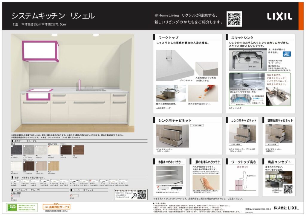 エアリィホワイトの扉と人造大理石ワークトップ(グロウホワイト)で白を基調にまとめ、明るく清潔感あふれる空間に仕上げたキッチンリフォームです。シンクには水はねや汚れに配慮された形状のスキットシンク(ステンレス)を採用することで、日常のお手入れの手間を軽減しました。