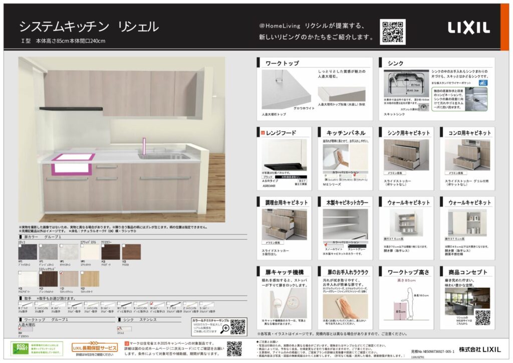 温かみのある木目調と機能的な使いやすさが共存する、毎日の料理が心地よくなるキッチンリフォームです。ラスティックアッシュの木目調扉にシルバー系のライン取手を組み合わせることで、温かみの中にも程よい軽やかさが生まれ、空間をすっきりとした印象に整えています。