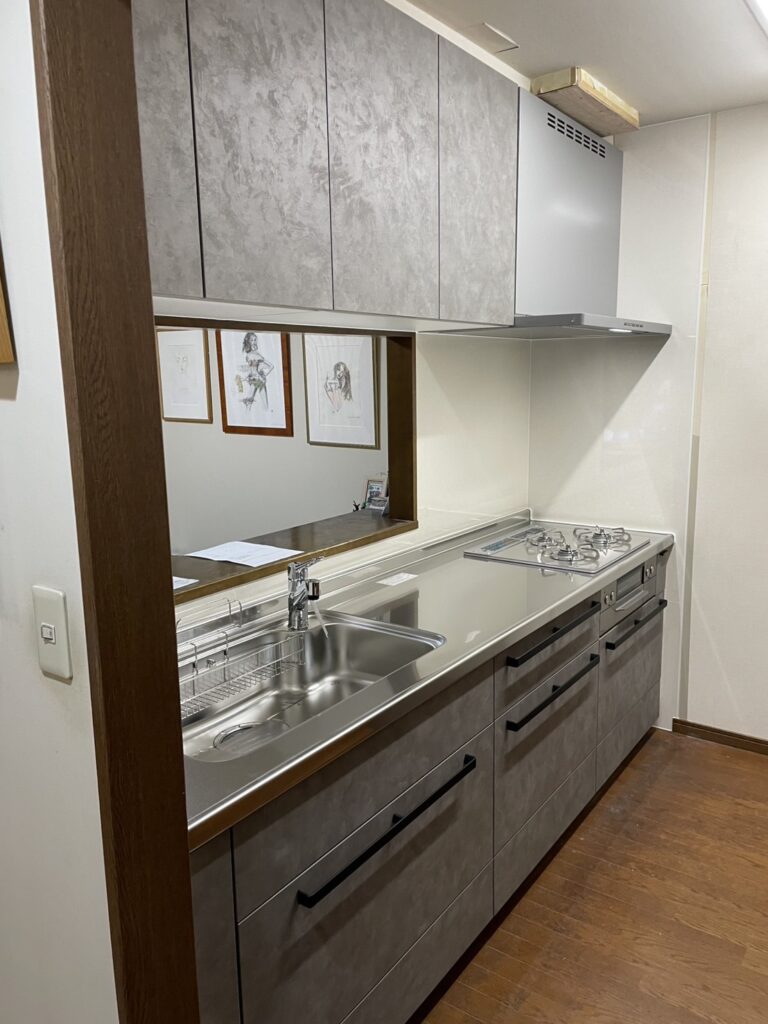 グレージュの石目調が空間にやさしく馴染みながら、ブラック系のライン取手がきりりとしたアクセントを加える、バランス感覚のあるキッチンリフォームです。全収納をスライドストッカーで統一し、調理器具やストック品を奥まで確認しながら整理できる、見た目も使い勝手もすっきりまとまったキッチンです。