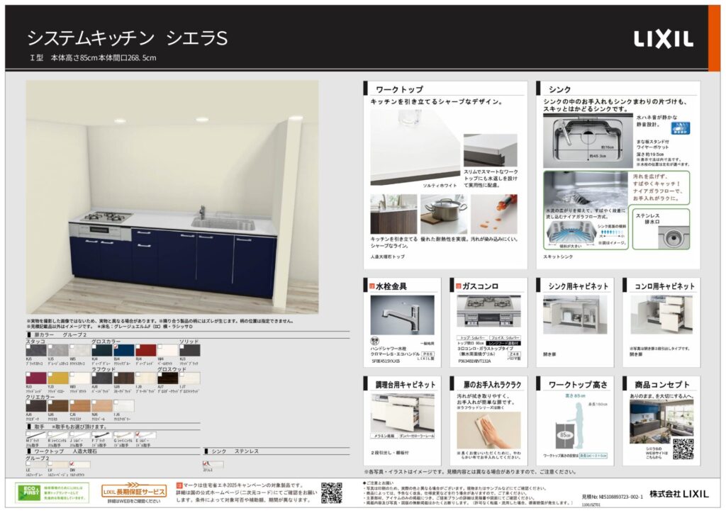 クラシックブルーの深みある色調が空間にぐっと力強い存在感をもたらし、人工大理石トップ(ソルティホワイト)の白さがその青を際立たせます。スキットシンクの手入れのしやすさとシングルレバー水栓クロマーレSのシンプルな操作性が水まわりの使い勝手を整えます。