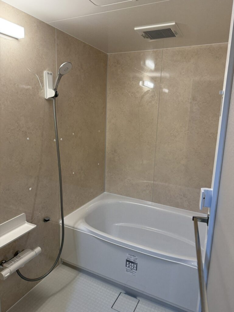 一日の終わりに「さっさと入って終わり」ではなく、少しだけ長居したくなる浴室リフォームです。ベージュ一色でまとめた壁面は主張せず、気づけば落ち着いているそんな雰囲気があります。ミナモ浴槽の水面の広さと保温機能が背中を押し、ランドリーパイプや握りバーといった実用的な設備が日常の細かな動作を静かに支えています。