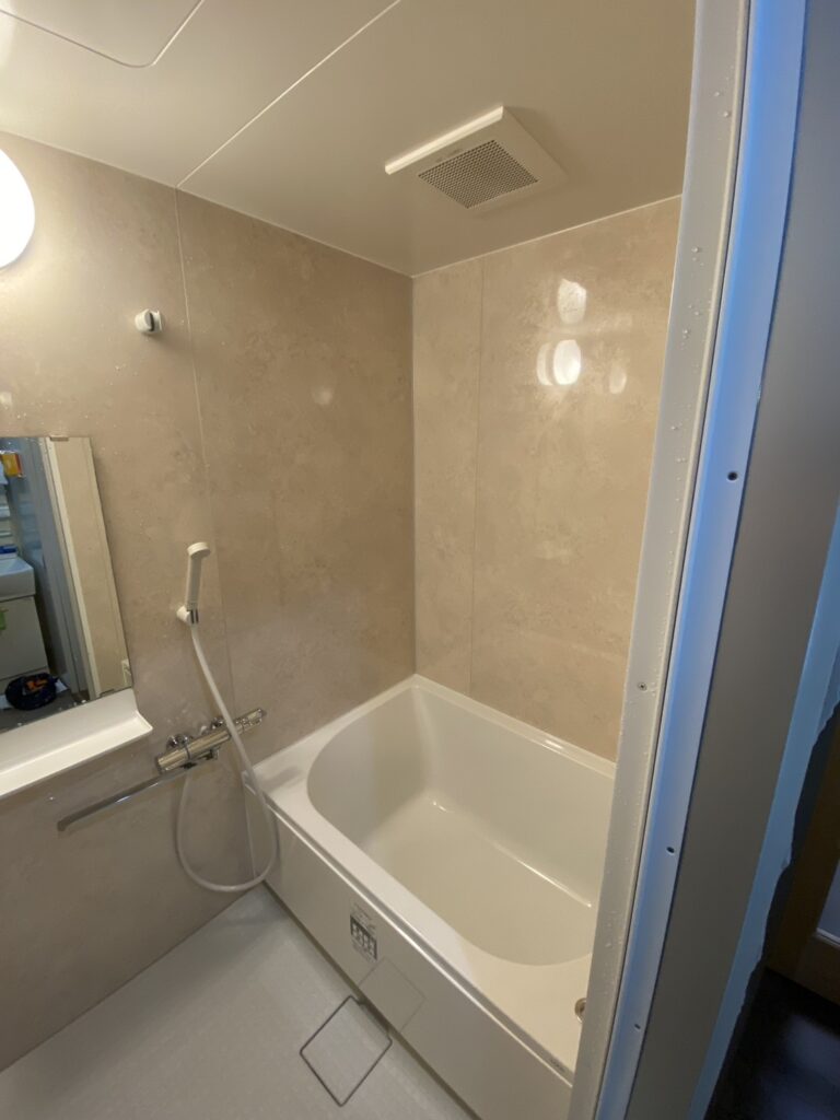浴室に入った瞬間、ふわっと包み込まれるような優しいマーフィルベージュの壁が印象的です。全面をこの柔らかな色で統一したことで、浴室全体がミルクティーのような温かみのある、リラックス感たっぷりの空間になりました。