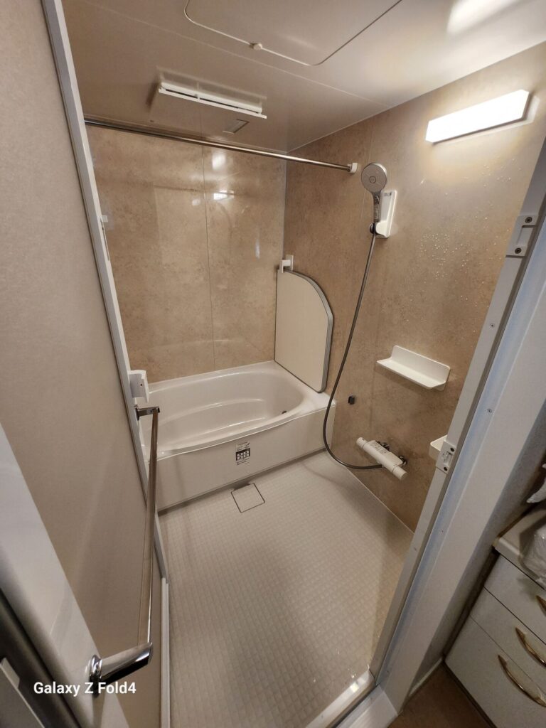 マーフィルベージュの優しさと、高機能シャワーで実現する、毎日が快適で心地よい浴室リフォームです。マーフィルベージュが浴室に自然で温かみのある表情をもたらし、キレイサーモフロアの床とホワイト系で統一した浴槽・エプロンとの組み合わせで、優雅で統一感のある上質な空間が生まれています。イッチ付エコアクアシャワーSPAは空気を含んだやさしい水流で、毎日のシャワータイムをより心地よく。スイッチで水流モードを自由に切り替えられるため、気分や季節に合わせたシャワーを楽しむことができます。