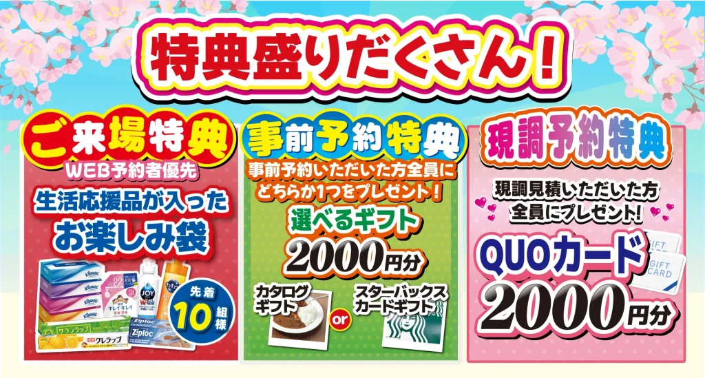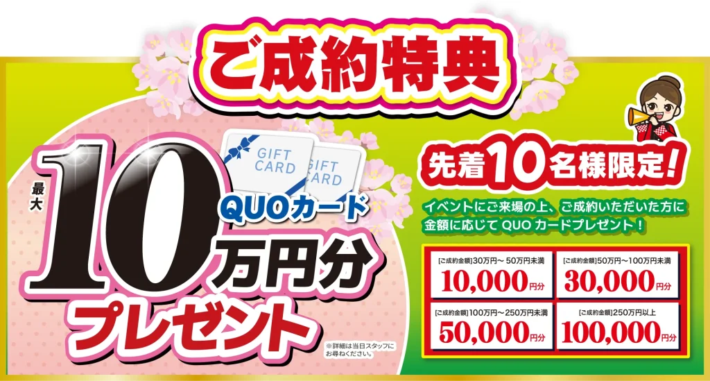 イベントにご来場の上、ご成約いただいた方に金額に応じてQUOカードプレゼント!
