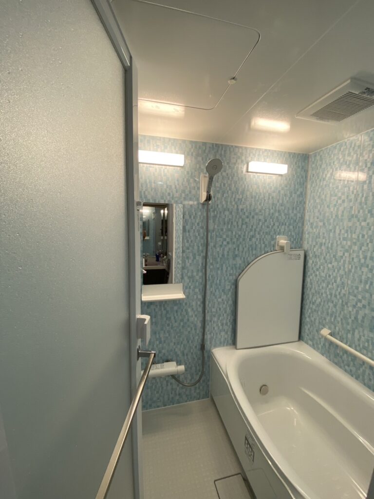 壁のモザイクアクアがやさしく光を受け、ホワイトと組み合わさることで綺麗で清涼感のある空間に仕上がりました。色の主張が強すぎないため、浴室全体が明るく広がりを感じられます。