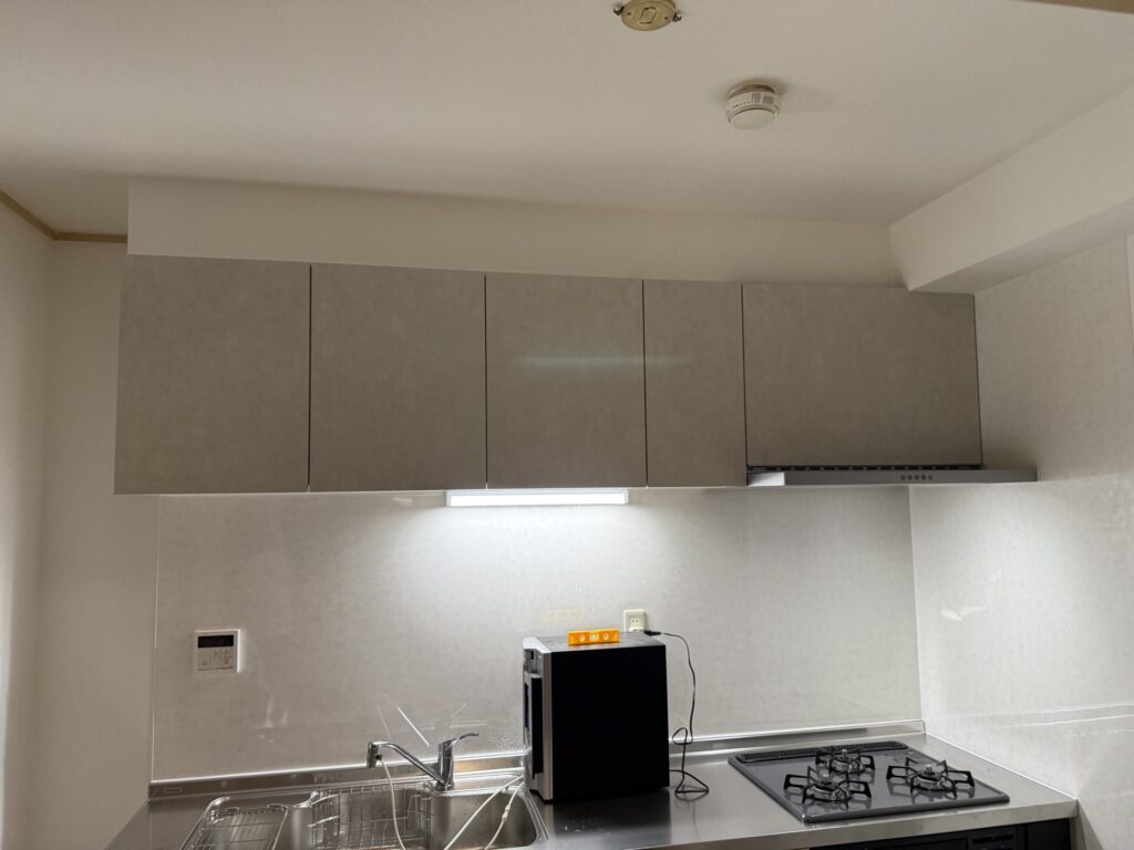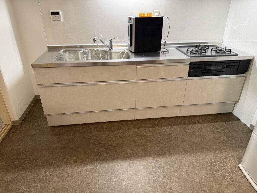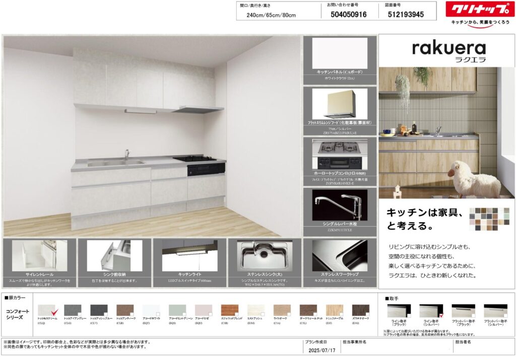 扉カラーにはトッコモカクリームを選び、全体をやさしいベージュトーンでまとめました。キッチンパネルはホワイトクラウドを合わせることで、重たくなりすぎず明るさも感じられる空間に。