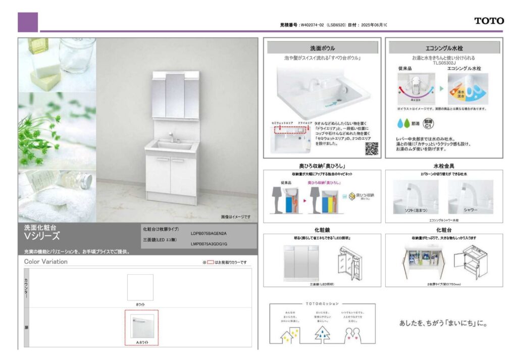 | 取り付け製品名 | TOTO 洗面化粧台Vシーリズ |