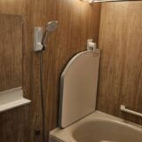 床はライトグレー、壁はプリズムブルーとミネラホワイトの組み合わせです。色を分けることで空間を整理し、全体を見やすく整えた浴室リフォームです。