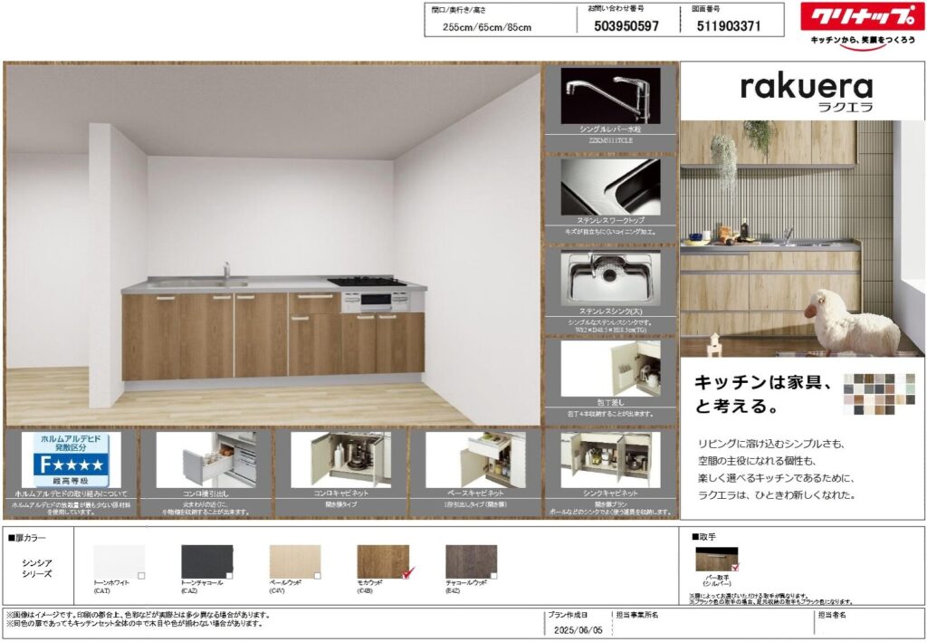 クリナップのラクエラを採用しました。扉カラーにはモカウッドを選定し、木目調のデザインがキッチン空間に落ち着いた印象を与えます。キャビネットには、設調理器具やキッチン用品を整理して収納できる構成になっています。