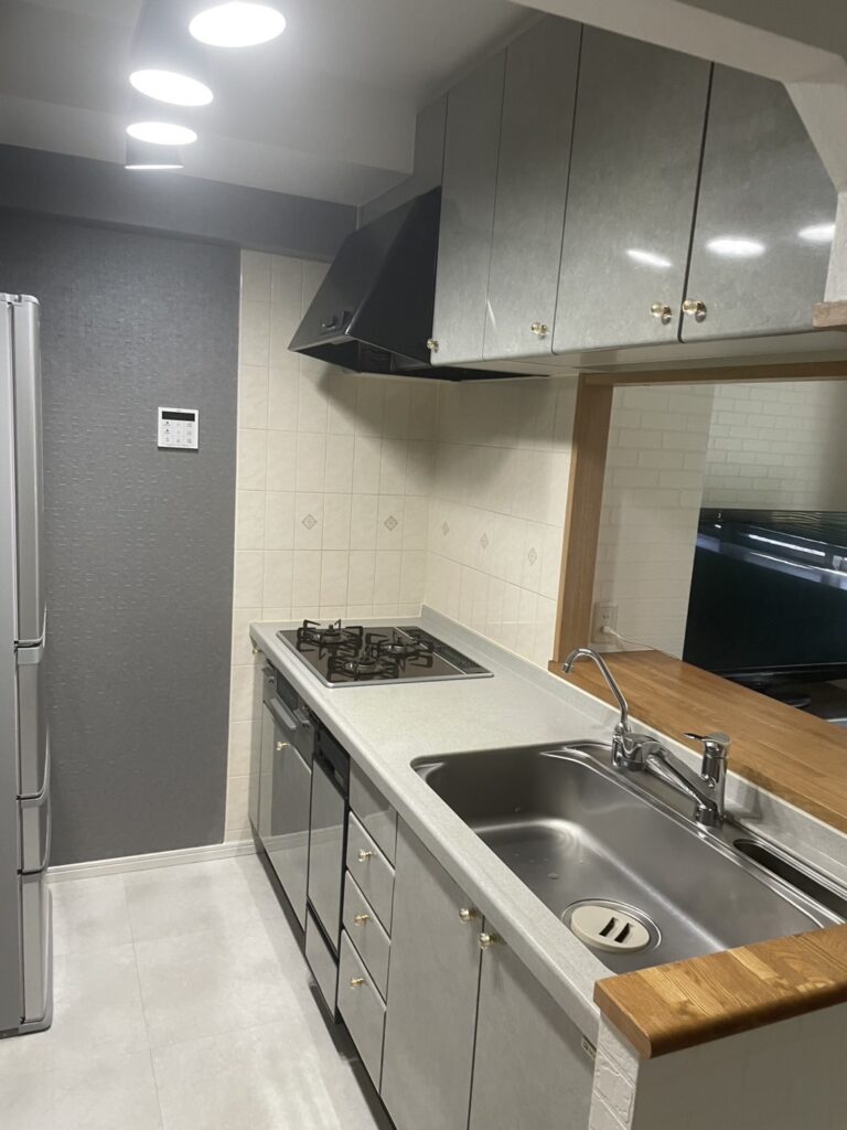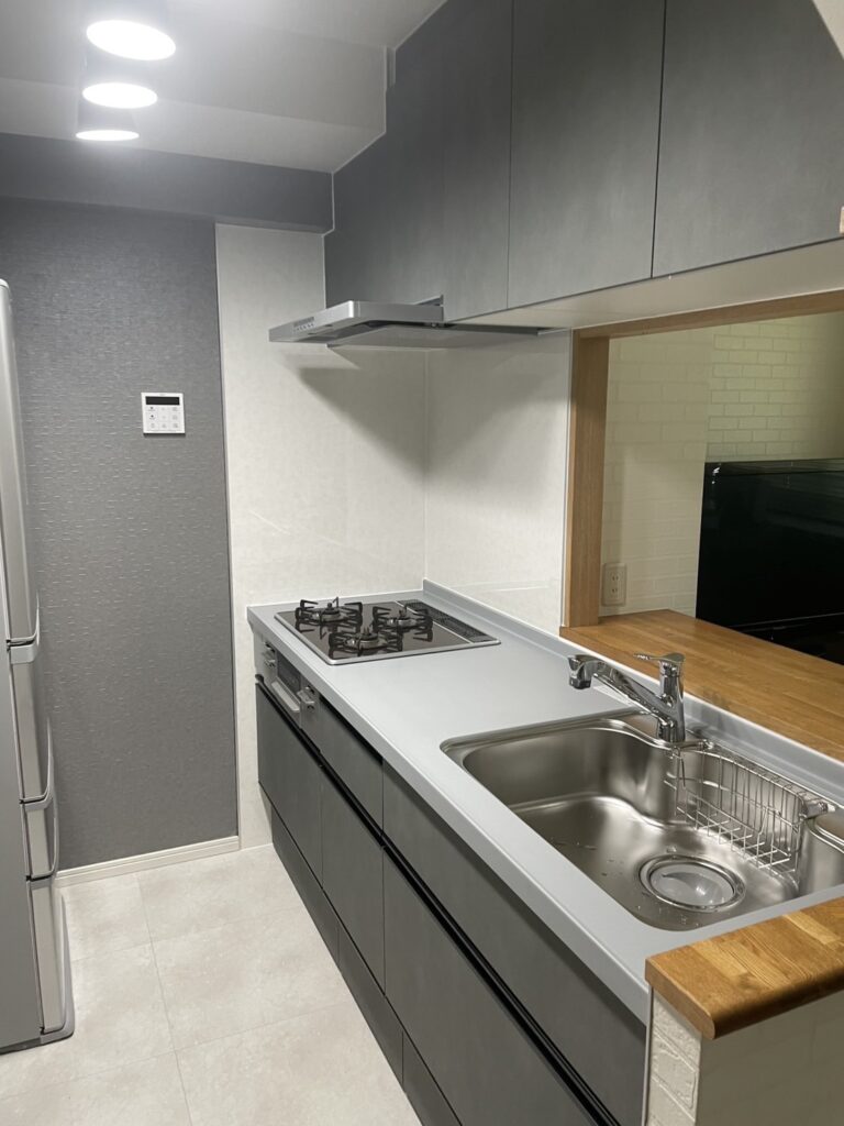 今回のキッチンリフォームでは、クリナップのシステムキッチン「ラクエラ」を採用。扉カラーにはトッコアイアングレーを選定し、石目調のグレーカラーが落ち着いた印象のキッチン空間に仕上がっています。