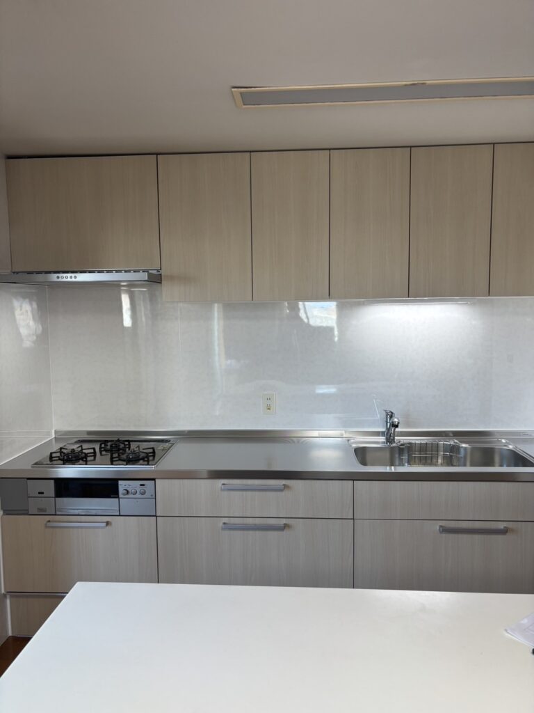 扉カラーにはペールウッドを選定し、やわらかな木目の風合いが空間に馴染むナチュラルなキッチンに仕上がっています。ステンレスワークトップのシンプルな天板を組み合わせることで、キッチン全体をすっきりとした印象にまとめています。