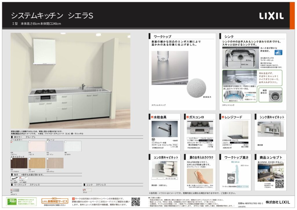ワークトップとシンクにはともにステンレスを採用し、水や汚れに強い素材が調理スペースをいつも清潔で使いやすい状態に保ちます。水栓にはシングルレバー水栓を取り入れ、レバー一つで吐水・止水から水量・温度の調整までをスムーズに操作できるため、日々の調理や洗い物をより快適に行えるキッチンに仕上げています。