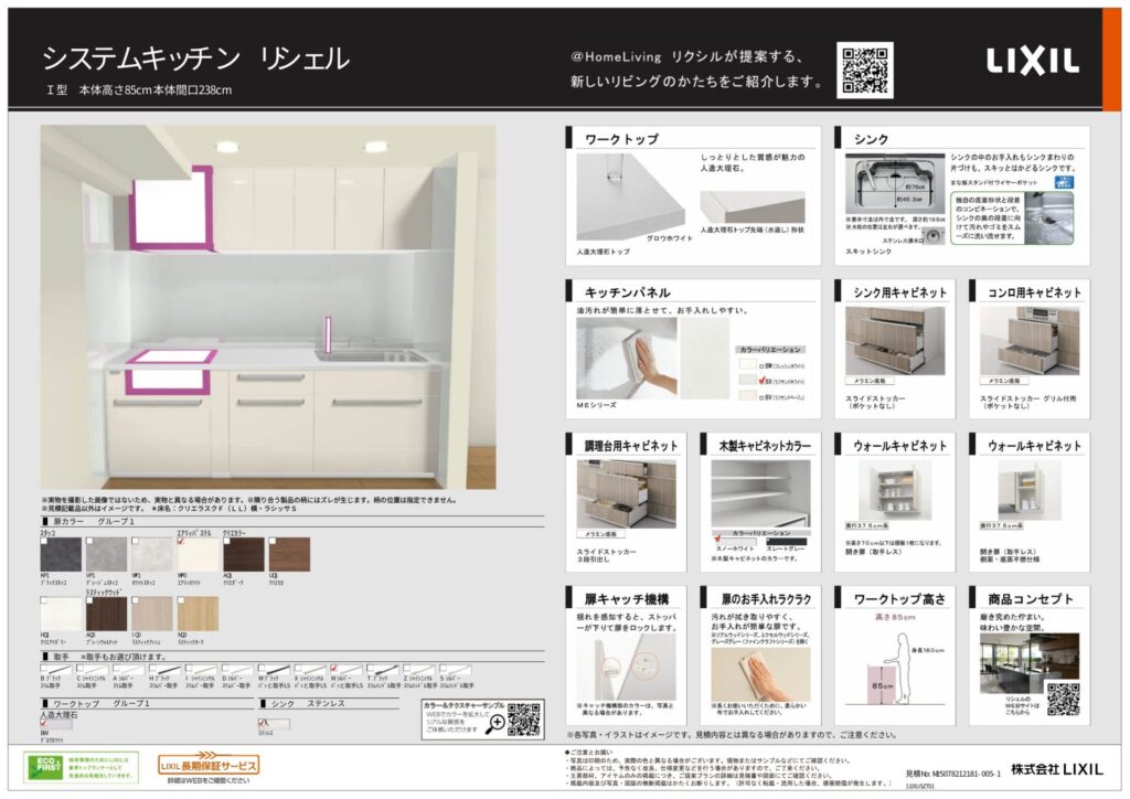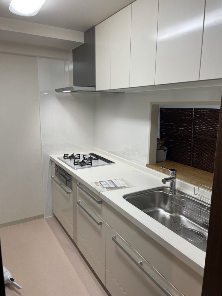 今回のキッチンリフォームでは、LIXILのシステムキッチン「リシェル」を採用し、扉カラーにはエアリィホワイトを選定することで、清潔感のある明るい印象に仕上げています。ワークトップには人造大理石トップ(グロウホワイト)を使用し、明るい色味が手元の視認性を高めることで調理中の作業がしやすいキッチンを実現しました。