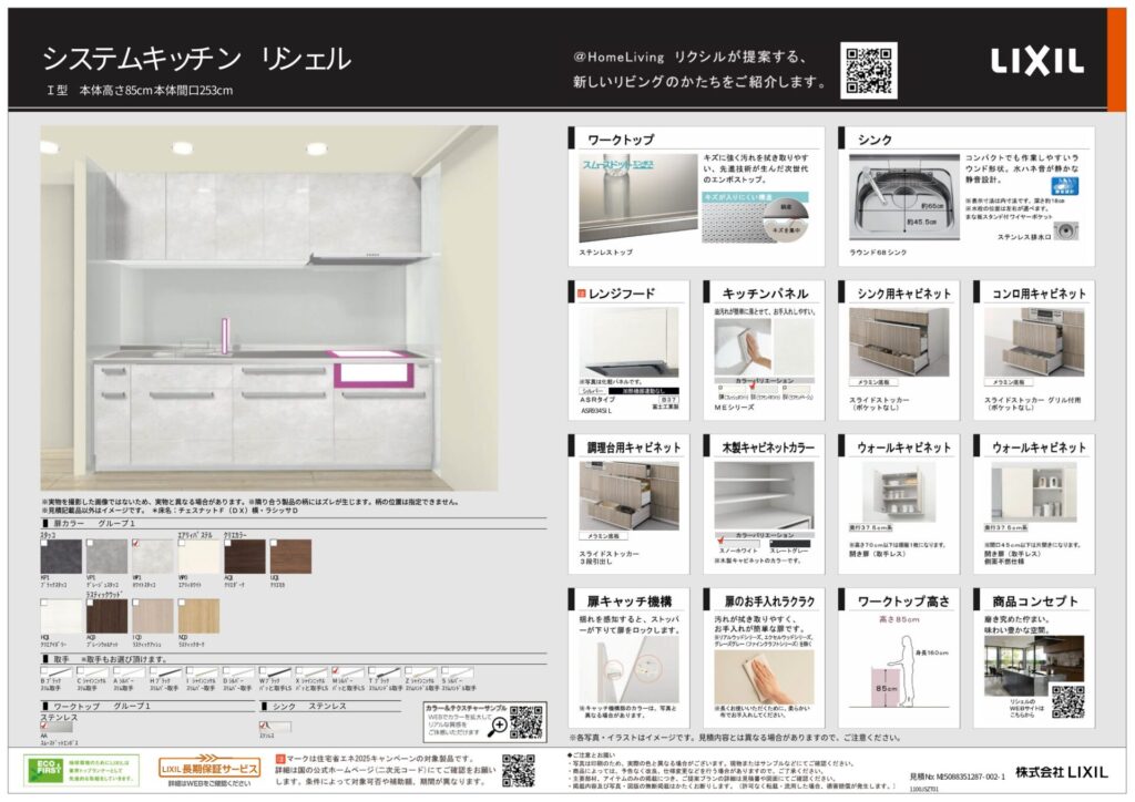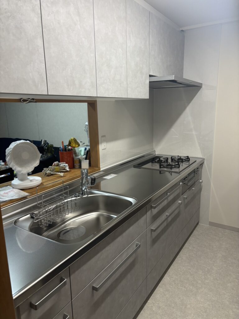 使いやすさと清潔感を両立させたキッチンリフォームです。LIXILのシステムキッチン「リシェル」にホワイトスタッコの扉を合わせ、やさしい雰囲気の中にすっきりとした印象を演出しました。ワークトップとシンクはステンレス素材で統一し、傷や汚れに強く毎日の調理をしっかり支える耐久性を確保。シングルレバー水栓で水まわりの操作をシンプルにまとめ、ガスコンロとレンジフードの組み合わせで調理効率と空気環境を同時に整えています。