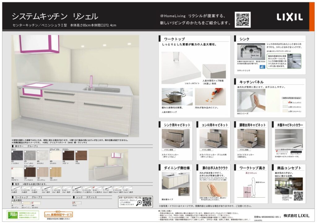 LIXILのシステムキッチン「リシェル」に人造大理石ワークトップとステンレスシンクを組み合わせ、日常の調理や水まわり作業を快適にこなせる環境を整えました。シングルレバー水栓で水の操作をシンプルにまとめ、ガスコンロとレンジフードの組み合わせで調理効率と空気環境を同時に確保しています。
