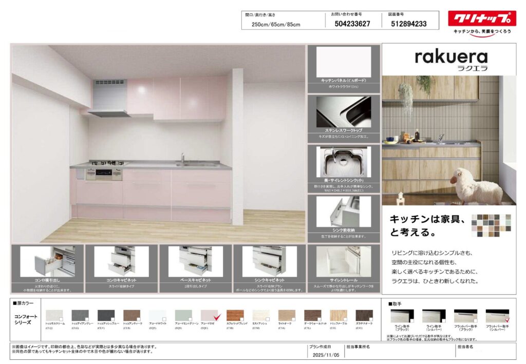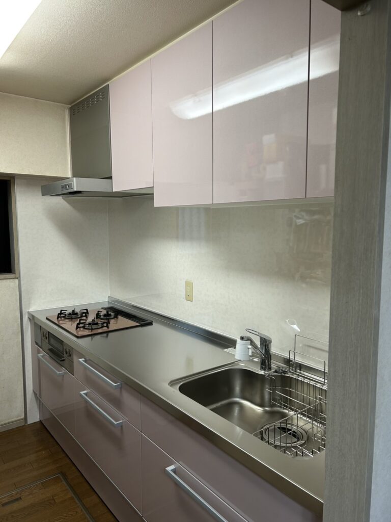 キッチンリフォーム アコードロゼの光沢のあるやわらかな色味が明るさを添える クリナップ ラクエラ