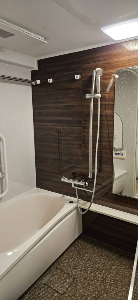 ブラウン(ラグ調)の床が水はけのよい構造で足元をさらりと保ち、濡れた状態でも不快感を抑えやすい浴室リフォームです。ゆるリラ浴槽の身体を支える形状が入浴時の姿勢を安定させ、魔法びん浴槽の保温性が時間が経っても心地よい湯温を維持します。