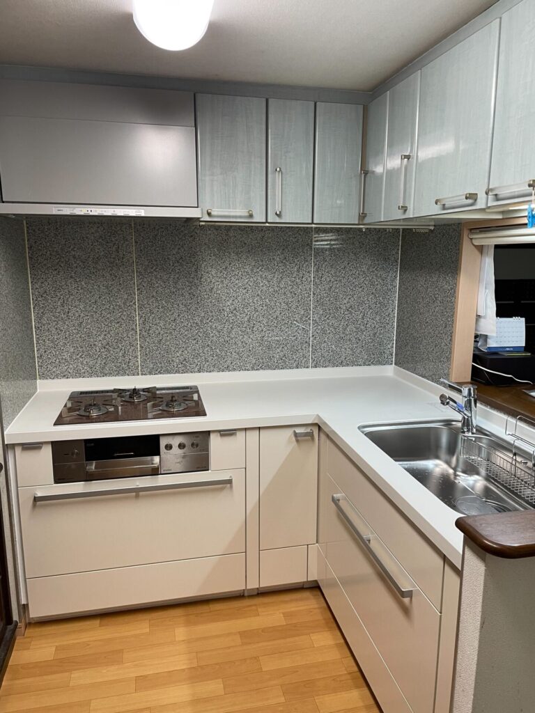 エアリィホワイトの扉とスノーホワイトのキャビネット、グロウホワイトの人造大理石トップで白を基調にまとめながら、デッドスペースになりがちなコーナー部分を回転棚付きの収納として余さず活用した、使い勝手にこだわったキッチンリフォームです。