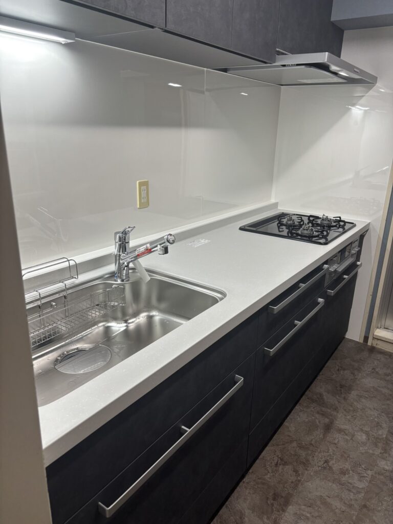 ブラックスタッコの石目調扉、ブラックのレンジフード、シルフィーグレーのワークトップと、濃いトーンを軸にすべてを揃えたトータルコーディネートが際立つキッチンリフォームです。色を絞り込むことで余計な主張がなくなり、キッチン全体がひとつの塊として空間に存在感を放ちます。