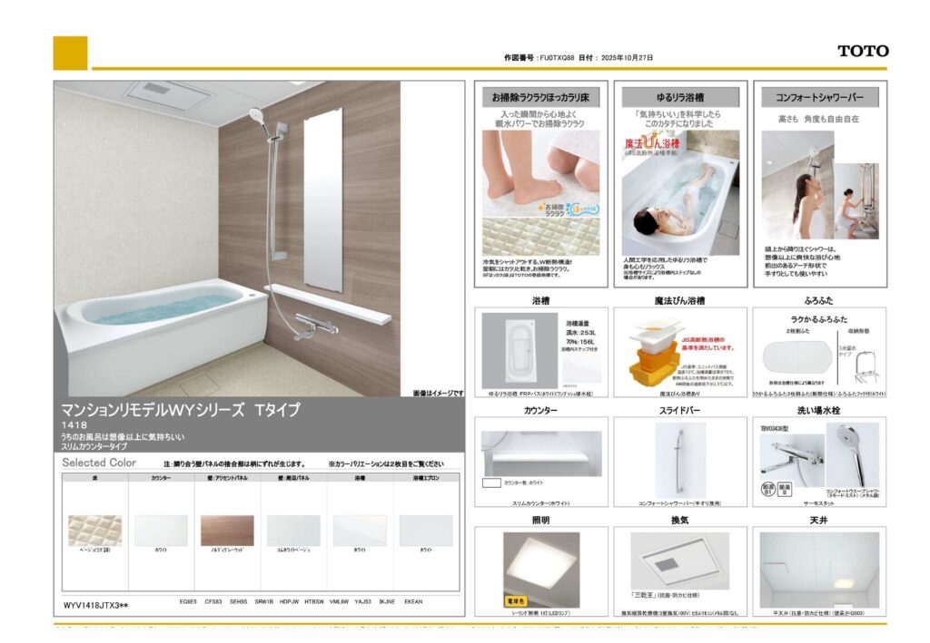 お掃除ラクラクほっカラリ床で毎日のお手入れも簡単。ゆるリラ浴槽と魔法びん浴槽で、入浴時の心地よさと温かさが長く続きます。スリムカウンターは空間を有効活用し、スッキリ棚水栓で毎日のお掃除も楽に。コンフォートシャワーバーは手すりとしても機能し、コンフォートウエーブシャワーの3モード・ミスト機能で、毎日のシャワータイムをより心地よくしてくれます。
