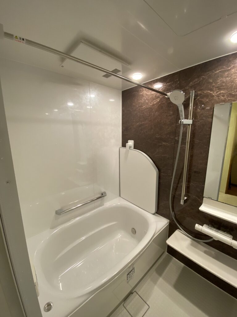 テオブロストーンのアクセント壁が浴室に自然な温かみと高級感をもたらし、クルムホワイトの周辺パネルとの組み合わせで、落ち着きと明るさが両立した空間が実現しています。ベージュの床とホワイトの浴槽・エプロンが優しく調和し、浴室全体に一体感のある温もりが広がります。