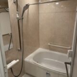 アクセントパネルにチェリーを採用したことで、白を基調とした浴室に自然なぬくもりが加わりました。床はベージュでまとめ、ナチュラルで落ち着きのある雰囲気に仕上がっています。床のキレイサーモフロアは冬でもヒヤッとせず、乾きやすいのでお手入れも簡単です。デザインと快適性を両立した浴室に仕上がりました。