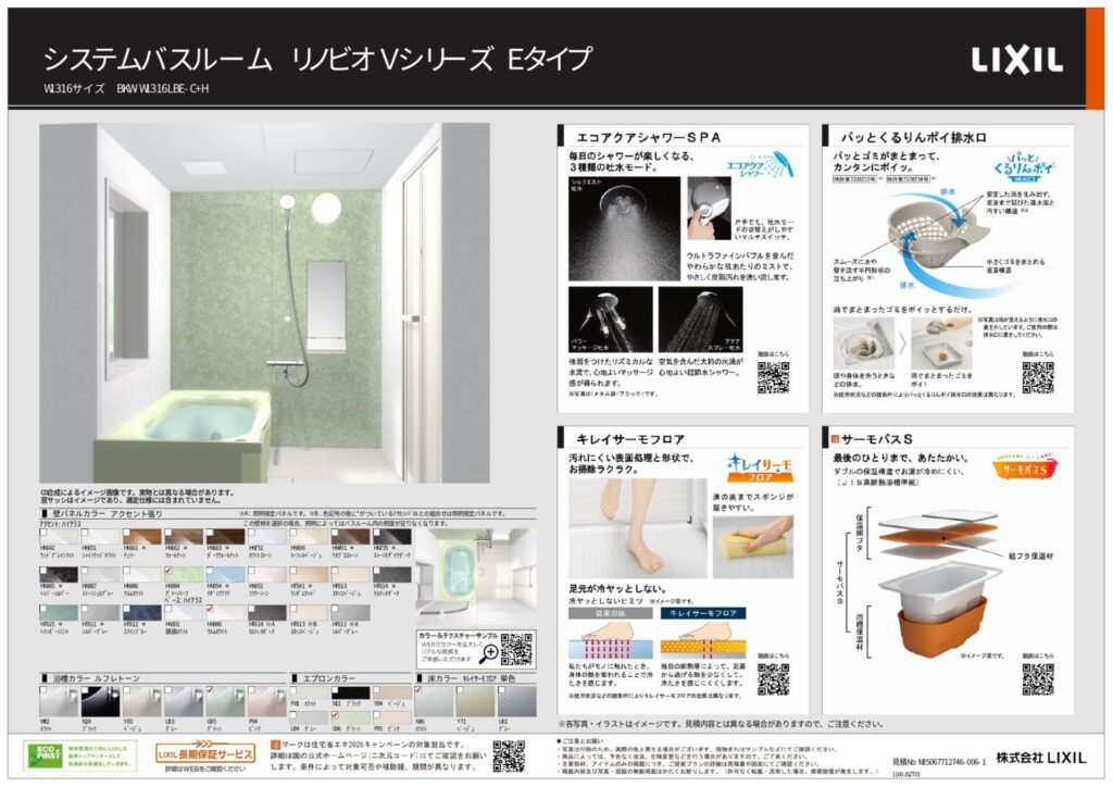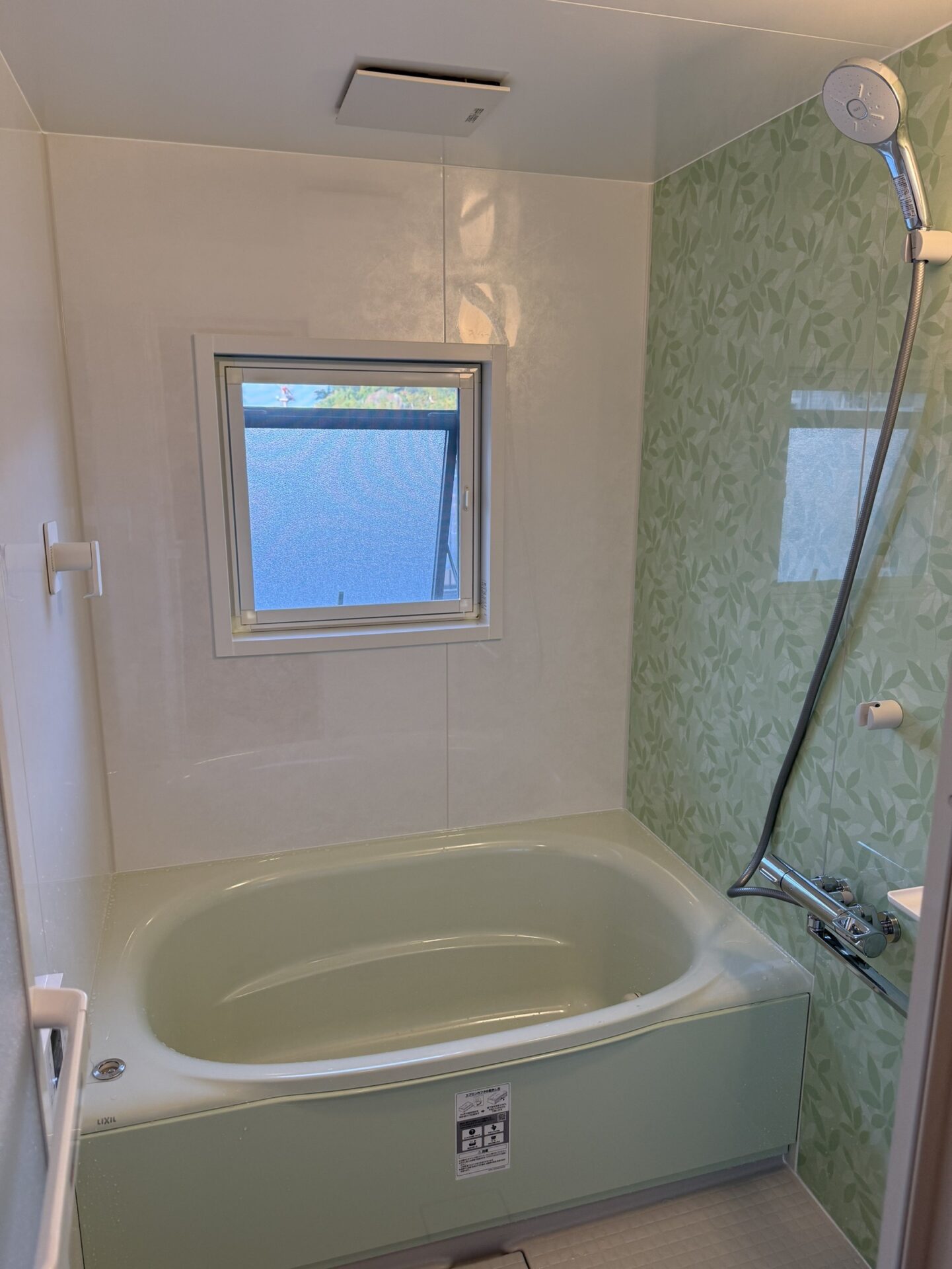 LIXILリノビオVシリーズを採用し、壁パネルにはグリーンリーフとクルムホワイトを組み合わせました。グリーンの浴槽とホワイトの床が爽やかに調和し、自然の中でくつろぐような穏やかな空間に仕上がっています。