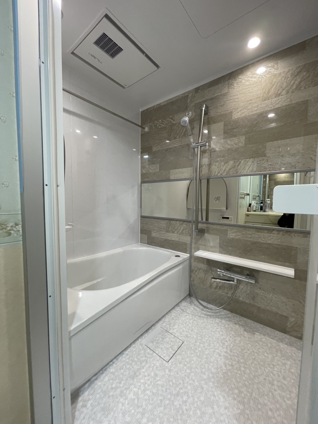TOTOマンションリモデルWYシリーズを採用し、アクセントパネルはパティオベージュを選びました。柔らかな光を反射するベージュトーンが浴室全体を明るく上品に彩ります。