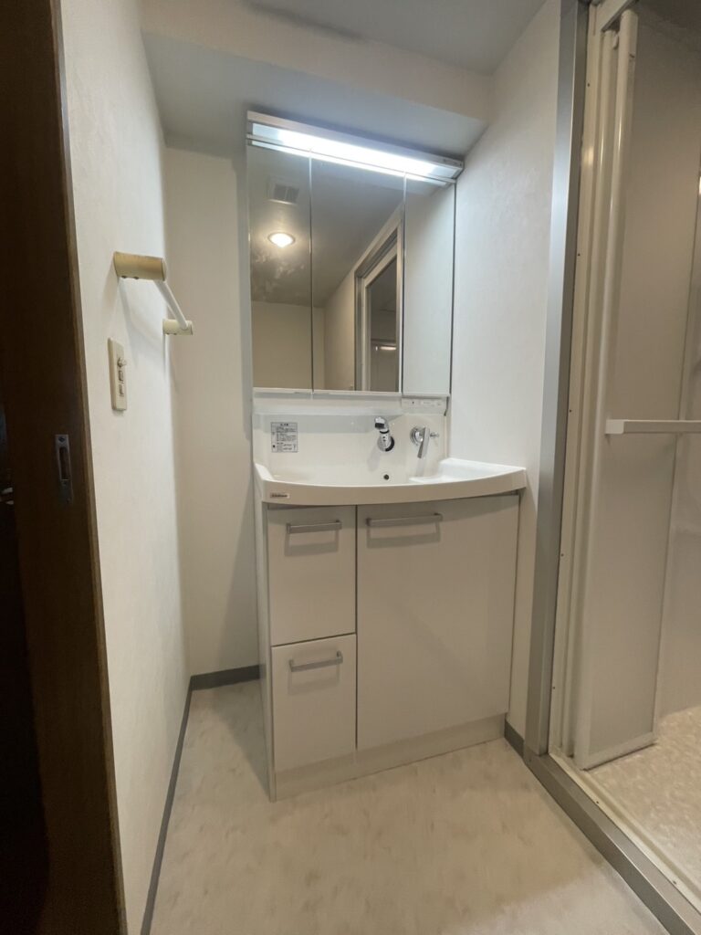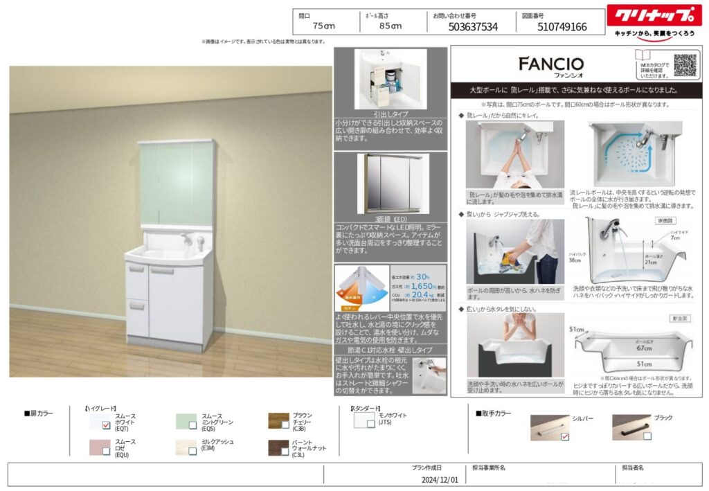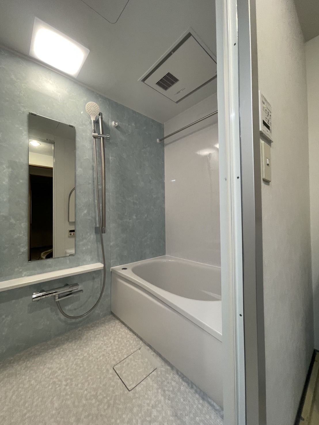 マテリアルアロマグリーンのパネルで爽やかさと落ち着きを演出。断熱浴槽とほっカラリ床により、保温性と安全性を兼ね備え快適な入浴が可能になりました。洗面台にはクリナップ ファンシオを設置。スリムで使いやすい設計ながら収納力も十分で、清掃もしやすい仕様です。