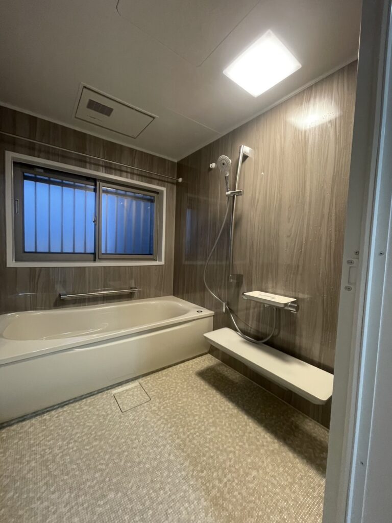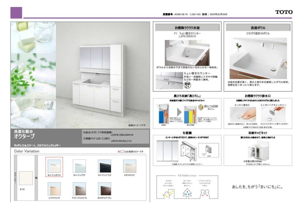 浴室はTOTOWYシリーズで、断熱構造の浴槽やほっカラリ床など機能性に優れた仕様に。木目調パネルがやさしい雰囲気を生み出し、入浴時間をより快適にしてくれます。洗面化粧台のオクターブは広々とした設計で収納力がアップしました。