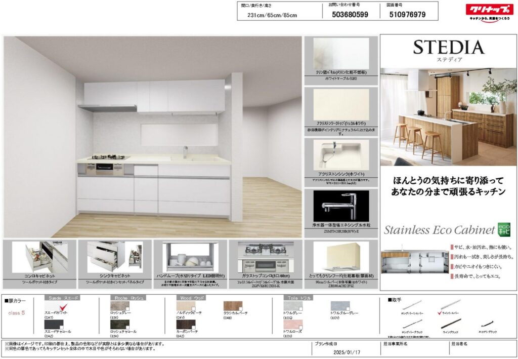 スエードホワイトのやさしいマットな質感に、シュクルホワイトのアクリストーンワークトップが美しく調和し、光の反射を抑えた穏やかな白がキッチンに広がりと清らかさをもたらしています。