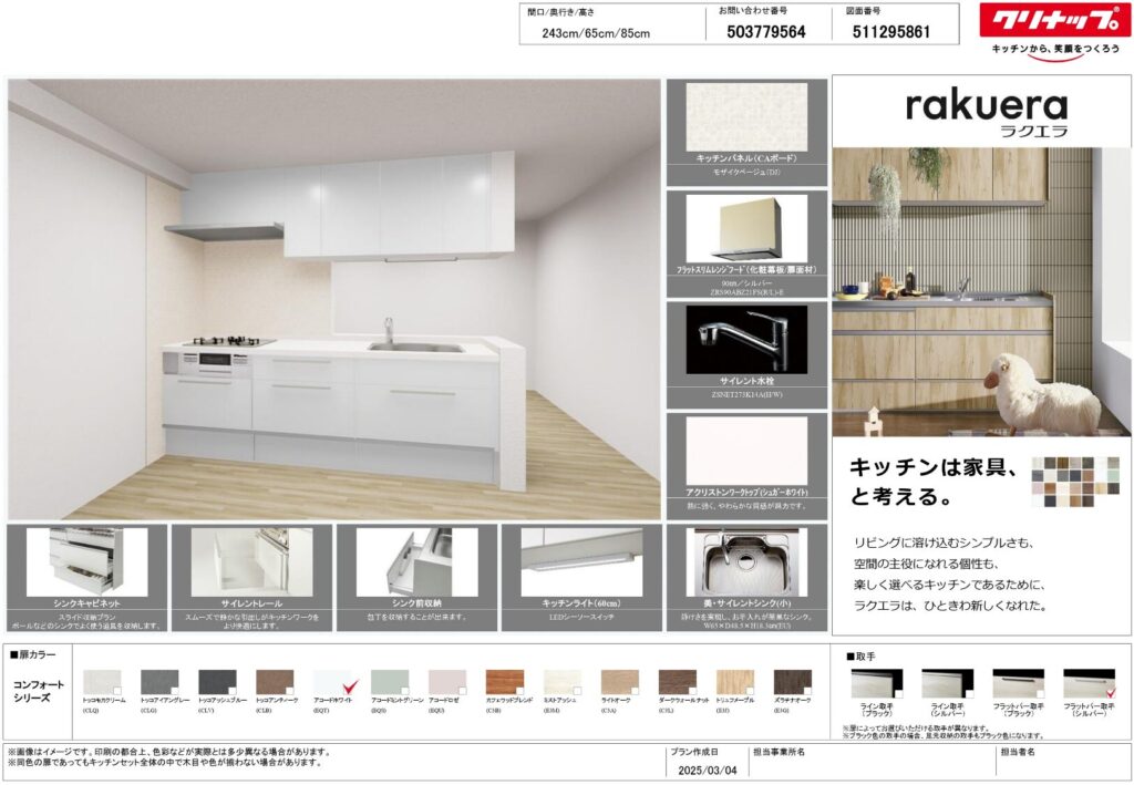 キッチンと洗面化粧台を白で統一することで、空間全体に明るさと広がりを感じさせる仕上がりに。ラクエラのシンプルで上品な扉デザインが清潔感を演出し、TOTOオクターブのすっきりとしたフォルムが生活感を抑えた美しい空間をつくりました。