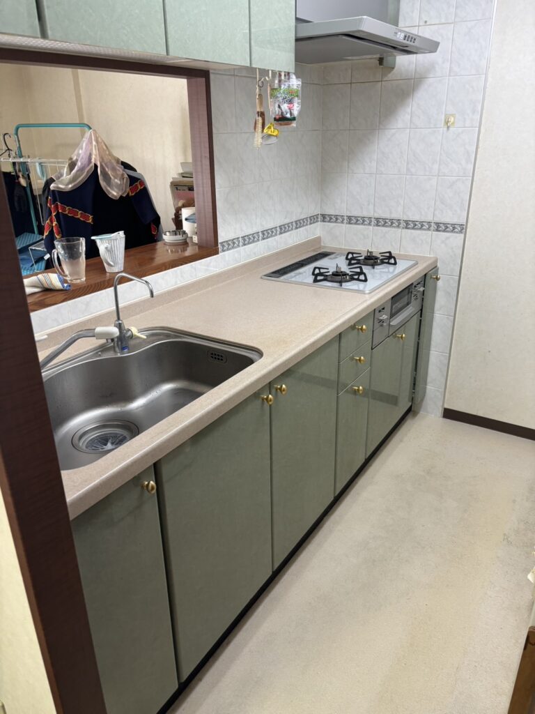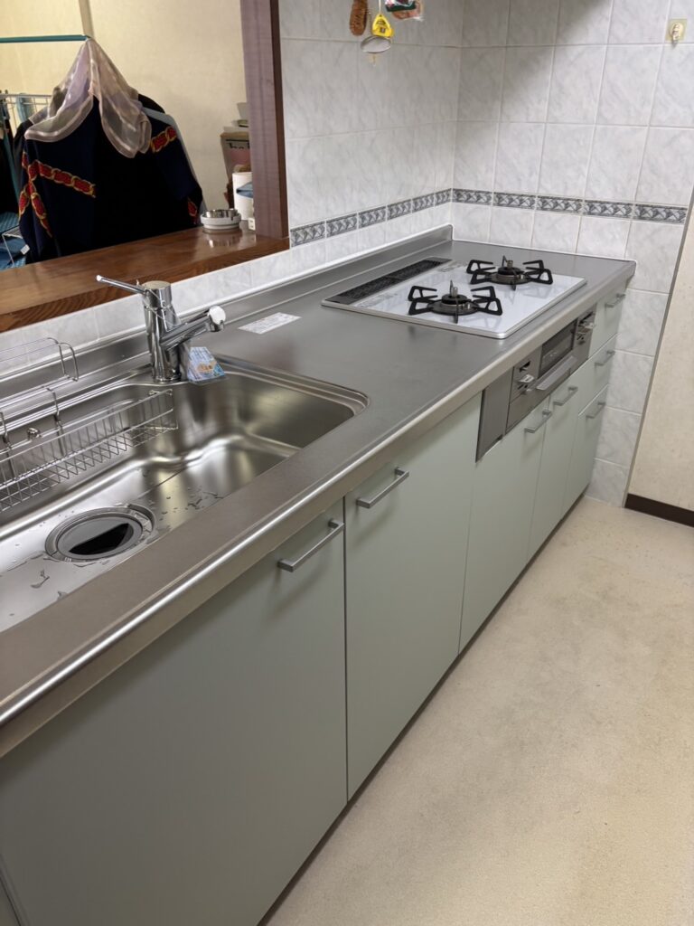 落ち着きのあるノールグリーンにステンレスワークトップの無機質な輝きが加わり上品で洗練された印象に。以前の面影は残しつつ、最新のキッチンに生まれ変わりました。