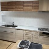 落ち着きのあるノールグリーンにステンレスワークトップの無機質な輝きが加わり上品で洗練された印象に。以前の面影は残しつつ、最新のキッチンに生まれ変わりました。